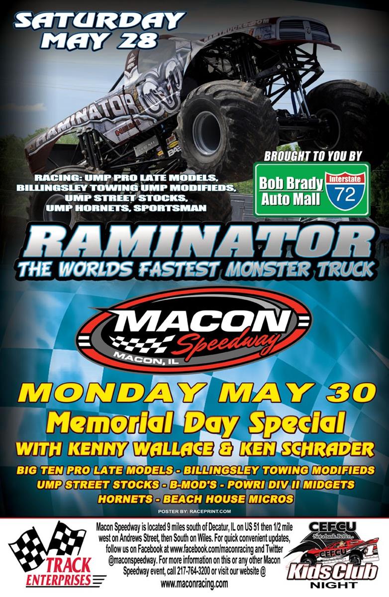 The first of 2 race days this Memorial Day Weekend is upon us. Tonight is an action packed program featuring a visit by the WORLD'S FASTEST MONSTER TRUCK Raminator presented by Bob Brady Auto Mall.