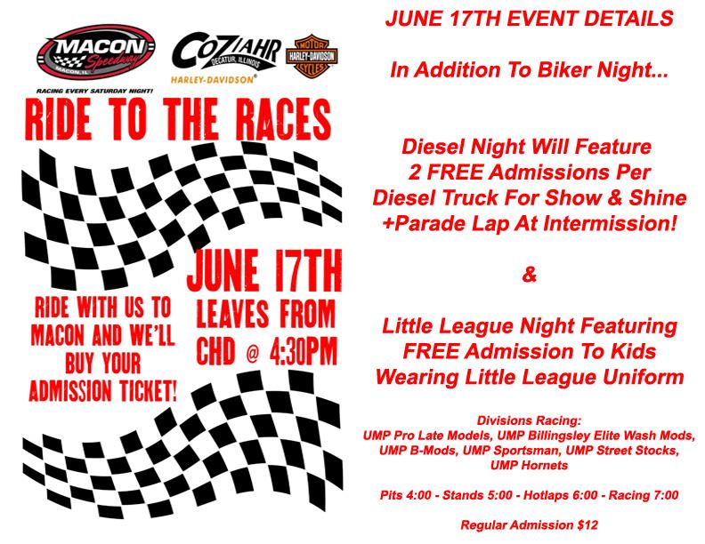 IT IS RACEDAY!!! Coming up TONIGHT, Saturday, June 17 is a night filled with Bikes, Diesel Trucks, & OF COURSE Race Cars! Coziahr Harley-Davidson is having a ride from the dealer at 4:30 PM to the track and those that ride Coziahr buys your ticket in.