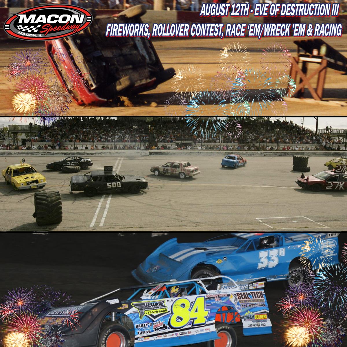 Eve Of Destruction III is now set for this Saturday, August 12 at Macon Speedway. Â In addition to six divisions of great racing action, fans will be treated to a car rollover contest at intermission. Â That's right, fans will judge who can roll a car over the best with the brave and daring drivers who have chosen to roll a car.