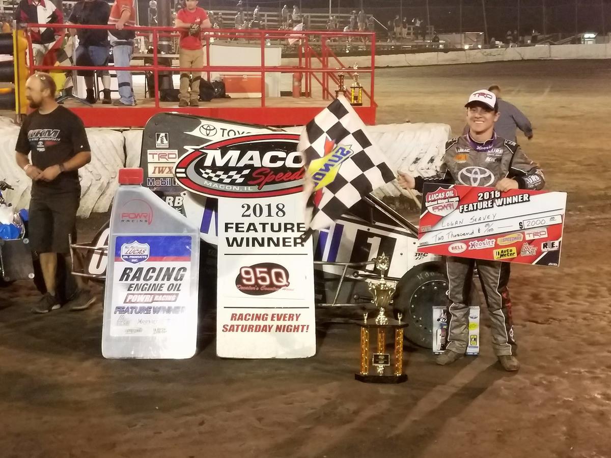 (Macon, IL) Logan Seavey of Sutter, California, took home his fourth POWRi Midget Series victory Saturday night at Macon Speedway. Thanks to a late race restart, Seavey took away the top honor from Jason McDougal and rode away with the win. Ryan Robinson, the points leader of the series, won his heat race and finished second to keep a strong lead in the early parts of the 2018 season. The race was full of action from slide jobs to flips and passing on both the top and bottom grooves, race fans were certainly entertained from the first night of three featuring the Lucas Oil POWRi National Midget Series. 71 racecars from POWRi took to the pit areas between the Midgets and the Speedway Motors Micro Sprints, presented by Bailey Chassis.
