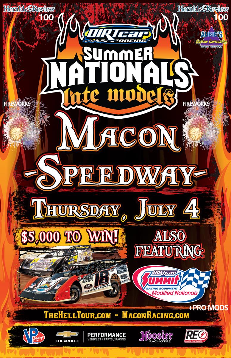 Happy Independence Day America! What better way to celebrate freedom than he 39th Annual Herald & Review 100 here at Macon Speedway! The cars and starts of the DIRTcar UMP Summer Nationalsare ready to do battle for 100 laps around the 1/5 mile bullring to try and add their name to the longest running event on the Summer Nationals schedule and the longest running event in Macon Speedway track history. The Summit Racing Equipment Modified Nationals will also be in action as part of their month plus long journey that is very similar to the Summer Nationals in total length as they square off against Macon's best in the BillingsleyRewards.com Modifieds. The Neal Tire and Auto Service Pro Modifieds round out the show. Come and see who adds their names to the history books as winners at Macon Speedway on one of the biggest nights all season long! There will be fireworks on the the track for sure, plus a display after the event as well. Full event information below: